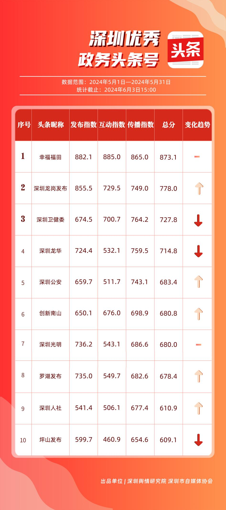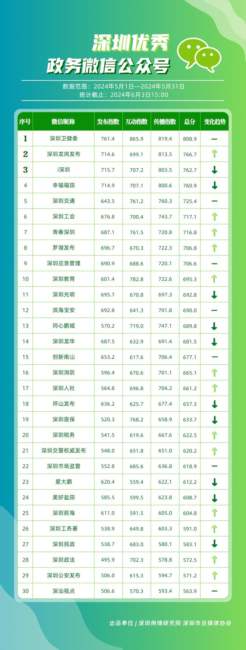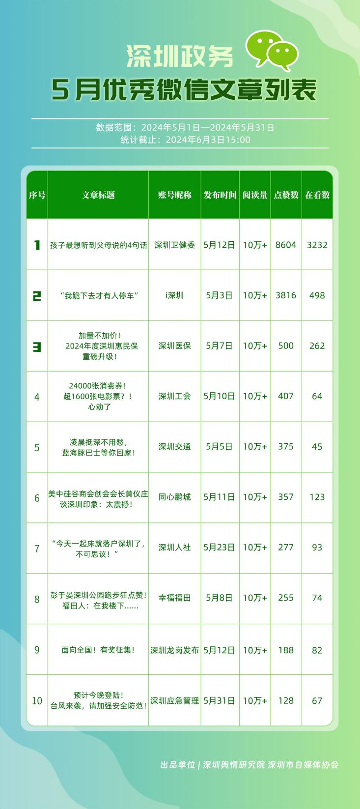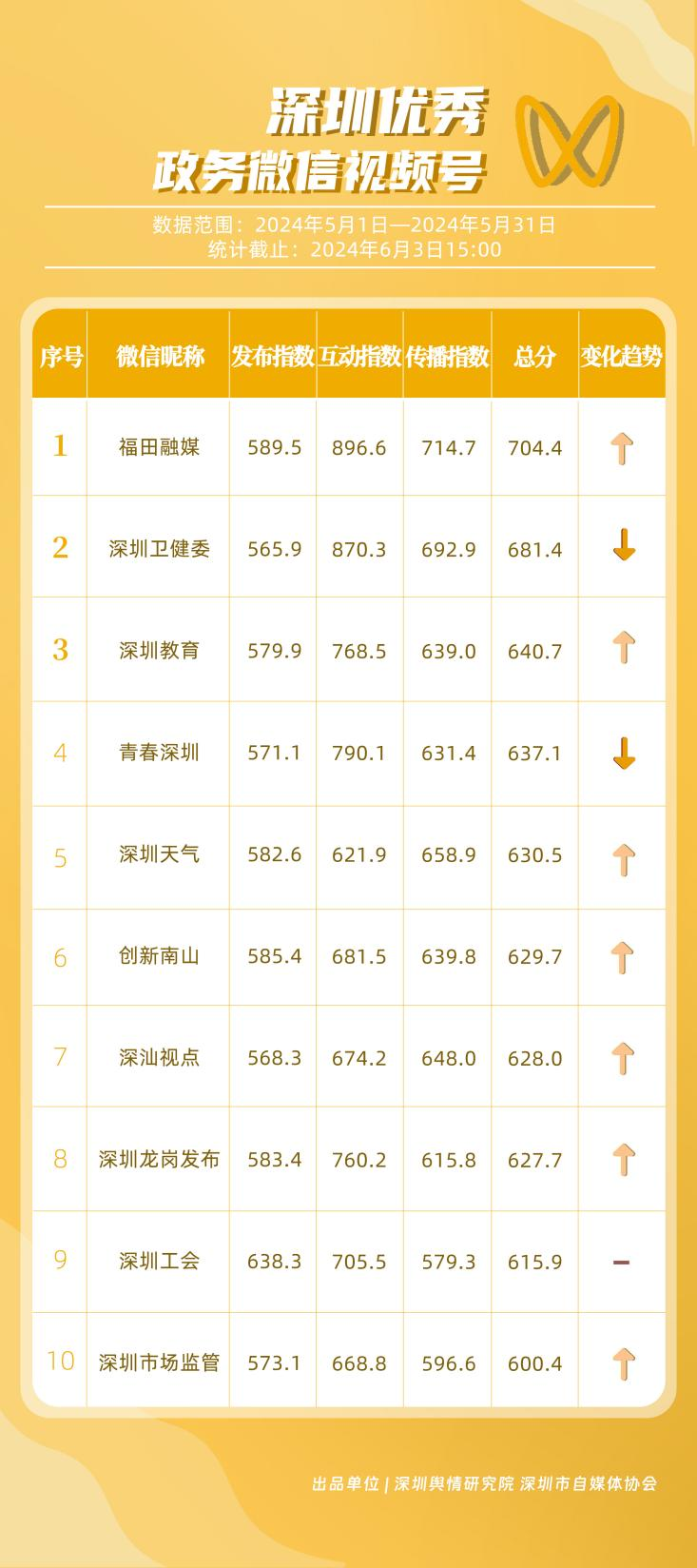 5月,“深圳衛(wèi)健委”“深圳龍崗發(fā)布”“i深圳”“幸福福田”“深圳交通”“深圳工會”“青春深圳”“羅湖發(fā)布”“深圳應急管理”“深圳教育”等30個政務微信公眾號,被評為“深圳優(yōu)秀政務微信公眾號”。5月,“深圳衛(wèi)健委”憑借精心創(chuàng)作的內容、與受眾深入互動,多篇作品深受好評,榮登榜單首位?!吧钲邶垗彴l(fā)布”“i深圳”“幸福福田”“深圳交通”等上榜公眾號也積極捕捉觀眾優(yōu)質作品需求,把握主流熱點趨勢,集中發(fā)揮政務媒體傳播力量,在本期也取得了較為亮眼的成績,進一步推動了政務信息傳播工作提質增效。