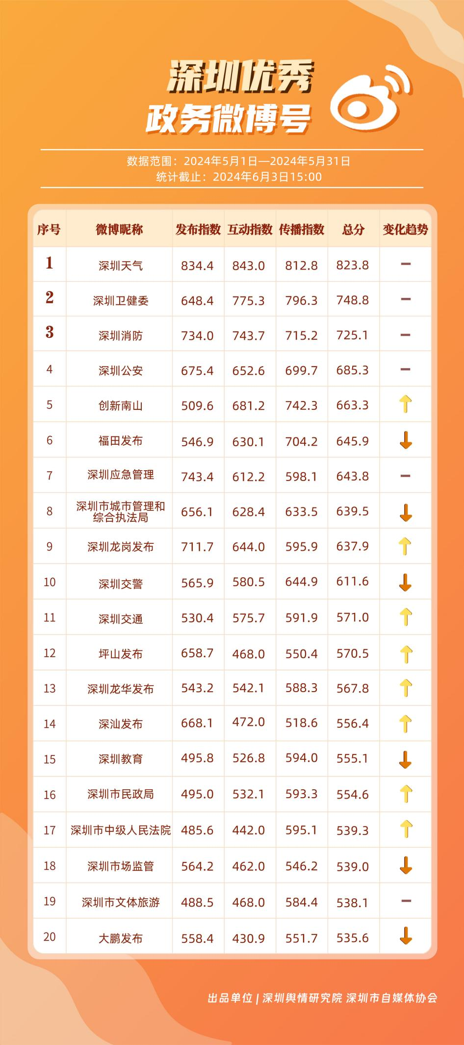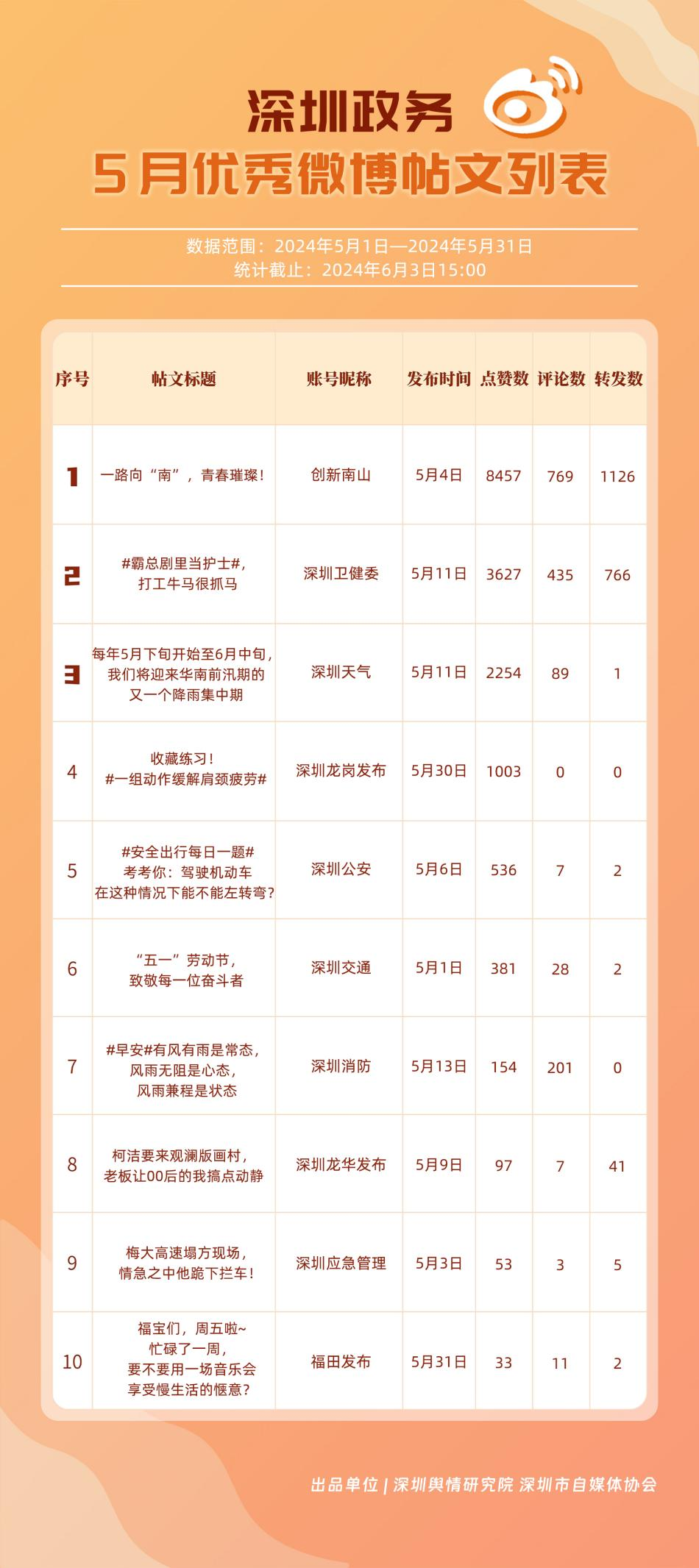5月,“深圳天氣”“深圳衛(wèi)健委”“深圳消防”“深圳公安”“創(chuàng)新南山”“福田發(fā)布”“深圳應急管理”“深圳市城市管理和綜合執(zhí)法局”“深圳龍崗發(fā)布”“深圳交警”等20個政務微博號入列“優(yōu)秀”名單。對比上期來看,“深圳天氣”“深圳衛(wèi)健委”“深圳消防”“深圳公安”發(fā)揮穩(wěn)定,能夠合理利用微博傳播渠道,持續(xù)輸出受眾喜聞樂見的高質量內容,“創(chuàng)新南山”“深圳龍崗發(fā)布”等微博號則在5月發(fā)力宣傳,整體傳播效果有所提升,收獲網(wǎng)民好評。