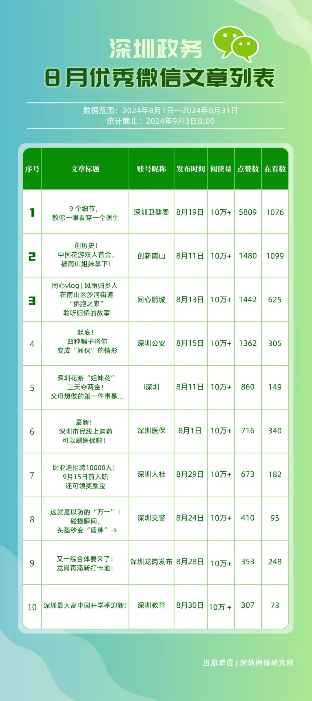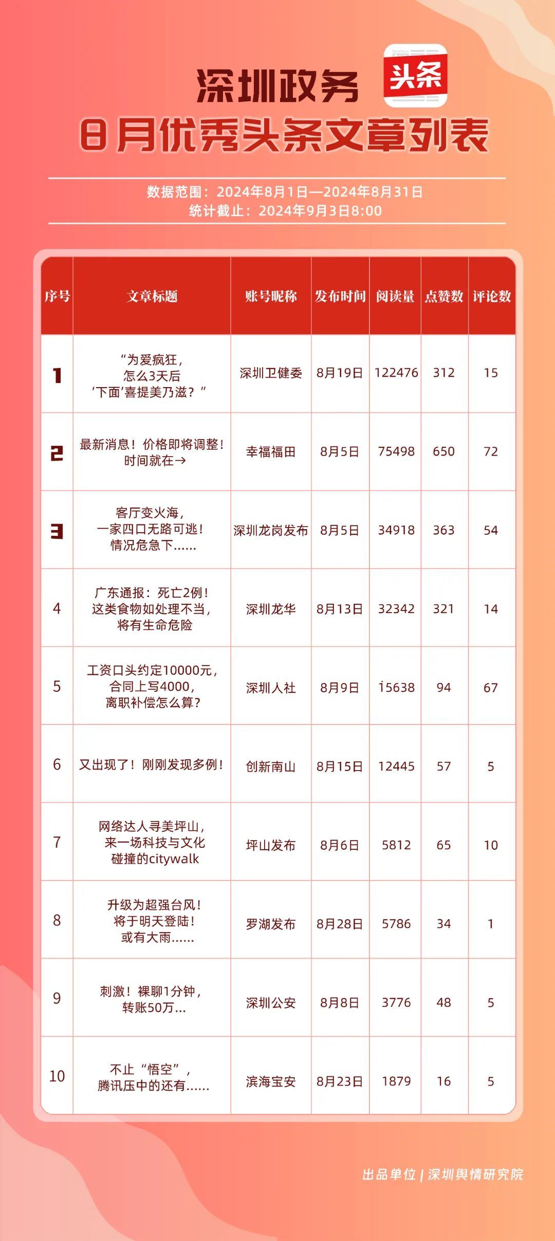 8月,“幸福福田”“深圳龍崗發(fā)布”“深圳衛(wèi)健委”“深圳龍華”“創(chuàng)新南山”“深圳人社”“深圳光明”“羅湖發(fā)布”“濱海寶安”和“坪山發(fā)布”共10個政務(wù)頭條號入選榜單。相關(guān)賬號的文章《“為愛瘋狂,怎么3天后‘下面’喜提美乃滋?”》《最新消息!價格即將調(diào)整!時間就在→》等貼近民生,傳遞實用信息,收獲了較高的閱讀量和點贊數(shù)。