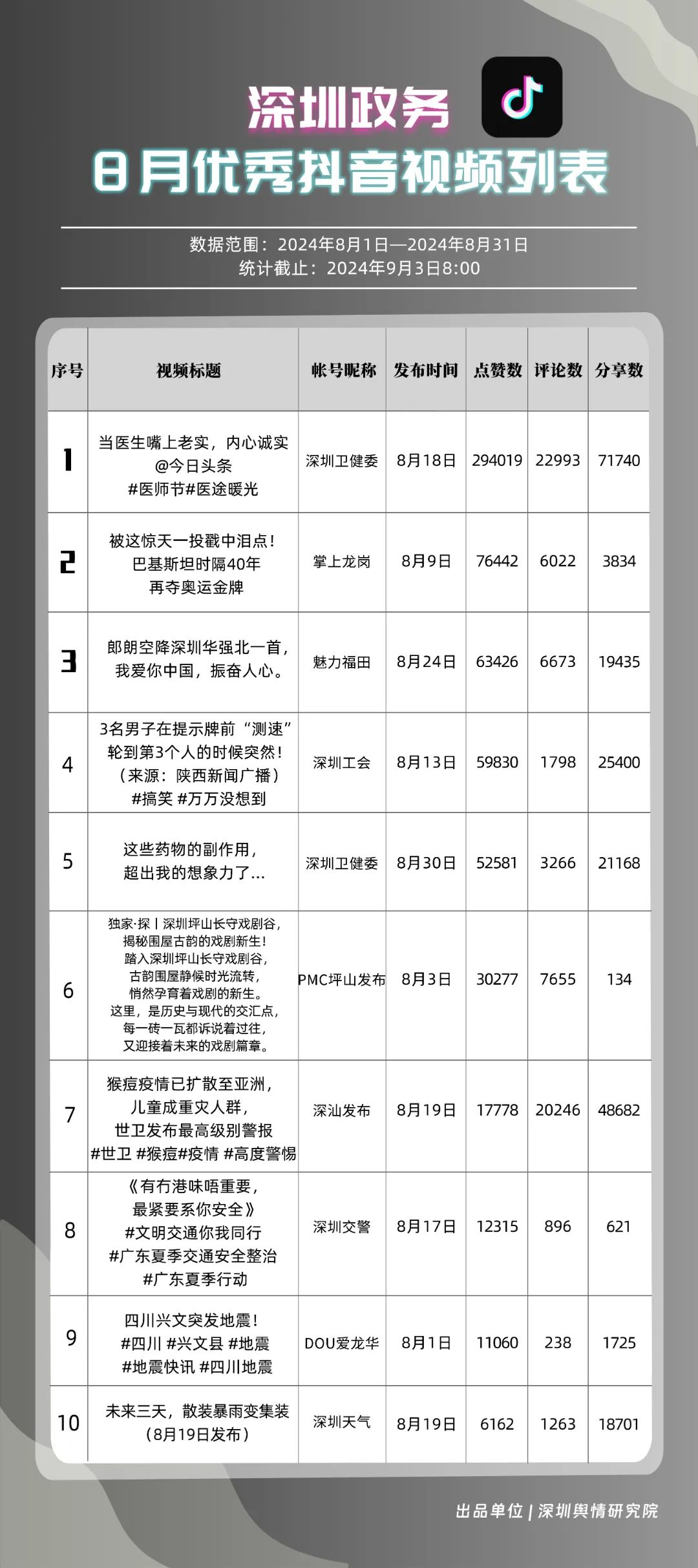 8月,“深圳衛(wèi)健委”“深汕發(fā)布”“掌上龍崗”“魅力福田”“深圳天氣”“深圳工會”“DOU愛龍華”“PMC坪山發(fā)布”“深圳交警”和“深圳公安”共10個政務(wù)抖音號獲得優(yōu)秀稱號,“深圳衛(wèi)健委”“深汕發(fā)布”“掌上龍崗”以高分居榜單前三,賬號有關(guān)“醫(yī)師節(jié)”“猴痘”“奧運金牌”的視頻獲得了較高的關(guān)注度和討論度,相關(guān)優(yōu)秀視頻在傳播信息的同時,也展現(xiàn)了深圳政務(wù)抖音號在內(nèi)容質(zhì)量、互動性和傳播度方面的實力。