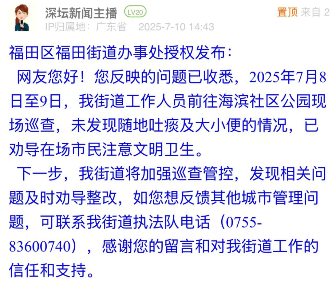 案例點評:對于市民反映的路面油污問題,布吉街道辦立即安排環(huán)衛(wèi)部門進行清洗,并于第二日在問政帖文下進行回復,以現(xiàn)場圖片展示路面清理效果,表示將加強后續(xù)巡查。此次處置展現(xiàn)了基層部門高效務實的問題處理能力,為城市道路環(huán)境管理提供了快速響應與長效維護相結合的實踐范例,切實回應了市民對潔凈環(huán)境的期待。