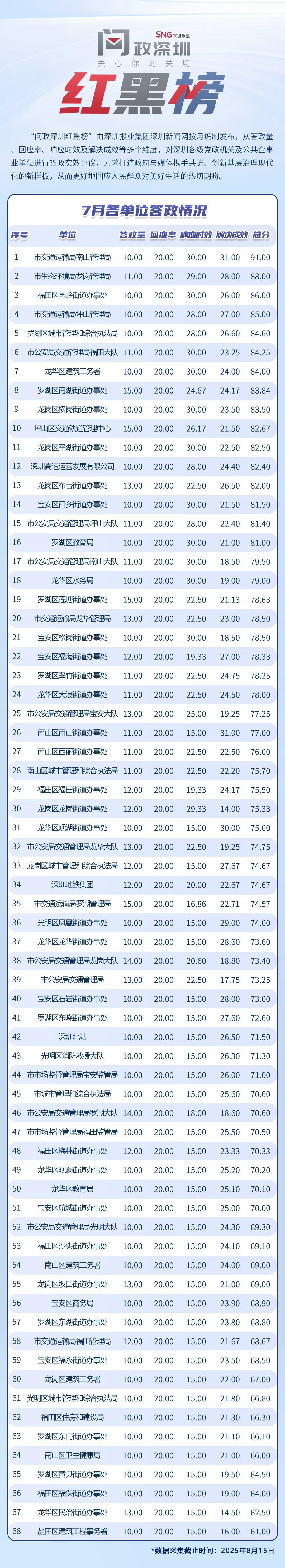 為探尋媒體如何精準賦能基層治理現(xiàn)代化的“深圳路徑”,近日,深圳報業(yè)集團正式掛牌成立“問政深圳”工作室,旨在進一步推動網(wǎng)絡問政工作的高效開展。為確保相關工作更加契合實際需求,深圳報業(yè)集團深圳新聞網(wǎng)按照“最快速度辦結”的總體要求,將原有月度榜單創(chuàng)新升級為“問政深圳紅黑榜”,并對評分體系進行了細致優(yōu)化。該榜單從答政量、回應率、響應時效及解決成效等多個維度,對深圳各級黨政機關及公共企事業(yè)單位進行答政實效評議,力求打造政府與媒體攜手共進、創(chuàng)新基層治理現(xiàn)代化的新樣板,從而更好地回應人民群眾對美好生活的熱切期盼。