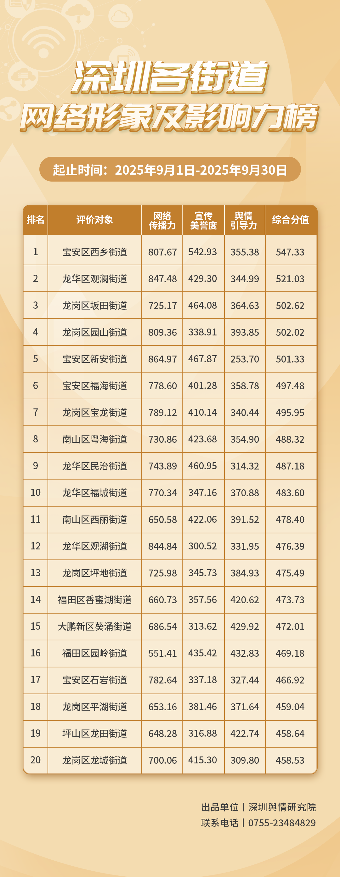 為深入了解深圳市各街道的網(wǎng)絡形象構(gòu)建狀況和社會影響,推動街道治理“提質(zhì)增效”,增強城市高質(zhì)量發(fā)展動能,深圳輿情研究院編制推出《深圳各街道網(wǎng)絡形象及影響力榜》。榜單具有獨立客觀的評價體系,通過數(shù)據(jù)采集和分析,評估各街道的網(wǎng)絡傳播力、宣傳美譽度及輿情引導力,并對全市11個區(qū)共78個街道的網(wǎng)絡形象及影響力進行綜合排名。