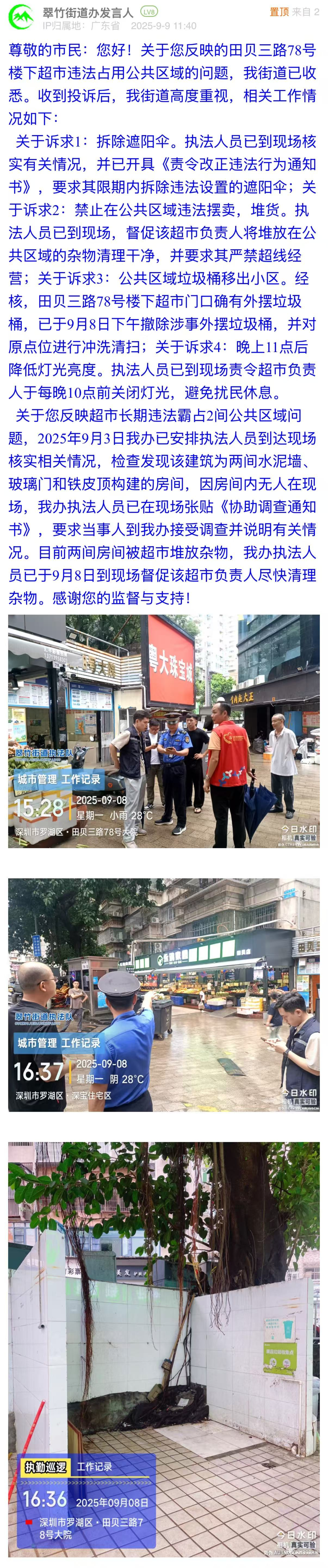 案例點(diǎn)評(píng):本案例中,翠竹街道辦立足市民訴求,對(duì)違規(guī)搭建遮陽傘、占用公共區(qū)域、違規(guī)堆放垃圾、店面燈牌亮度過高這四個(gè)問題,街道均做到快速響應(yīng),并以圖片展示治理效果?;貞?yīng)既體現(xiàn)了基層執(zhí)法的規(guī)范性與時(shí)效性,又展現(xiàn)了對(duì)民生細(xì)節(jié)的關(guān)注力,踐行了“小事不小辦、事事有回音”的理念,為同類民生訴求的解決提供了可借鑒范式。