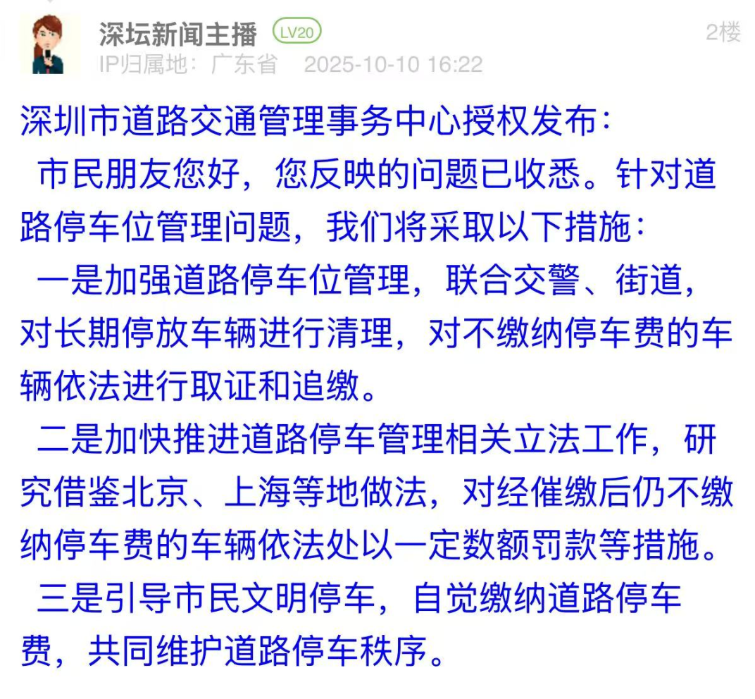 優(yōu)化建議:市民在帖文中反映,其此前的投訴件被標(biāo)記為“辦結(jié)”,但霸位車輛依舊未被移走,現(xiàn)場(chǎng)問題未解決,質(zhì)疑相關(guān)部門執(zhí)行力不足。對(duì)于市民的再次投訴,深圳市道路交通管理事務(wù)中心的回應(yīng)存在公式化、未切實(shí)回應(yīng)市民核心關(guān)切的問題,僅以“加強(qiáng)管理”“推進(jìn)立法”“引導(dǎo)文明停車”等回復(fù),難以消除公眾對(duì)治理執(zhí)行力的疑慮。建議后續(xù)強(qiáng)化回應(yīng)針對(duì)性,具體問題具體答復(fù),如公開執(zhí)法流程、提供處置證據(jù)等,以務(wù)實(shí)態(tài)度回應(yīng)市民監(jiān)督,提升治理公信力。