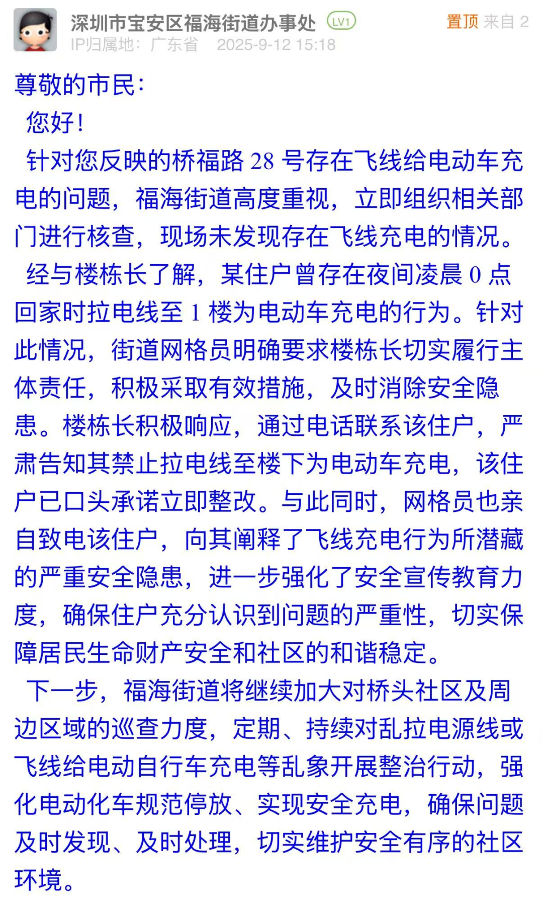 案例點(diǎn)評(píng):福海街道辦對(duì)電動(dòng)車“飛線充電”問題展現(xiàn)出快速響應(yīng)、權(quán)責(zé)明晰的治理態(tài)度,第一時(shí)間組織核查,既明確主體責(zé)任、嚴(yán)令整改,又細(xì)致開展安全教育,讓住戶充分認(rèn)知“飛線充電”的嚴(yán)重危害,體現(xiàn)執(zhí)法和普法的雙重?fù)?dān)當(dāng)?;貞?yīng)中,街道辦還表示將強(qiáng)化巡查力度、開展整治行動(dòng),建立長效治理機(jī)制,維護(hù)社區(qū)安全秩序,彰顯了基層治理中“問題導(dǎo)向、標(biāo)本兼治”的治理邏輯。