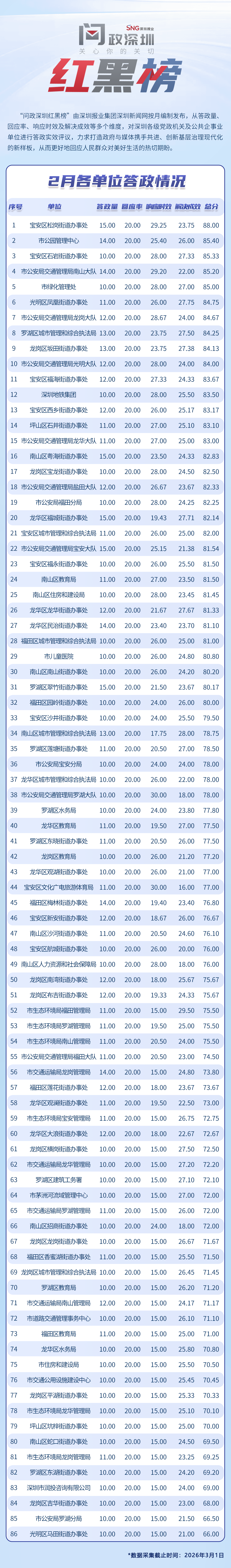 “問(wèn)政深圳紅黑榜”具有科學(xué)、合理、完備的綜合評(píng)價(jià)體系,能夠綜合評(píng)估深圳各級(jí)黨政機(jī)關(guān)和公共企事業(yè)單位的答政情況。