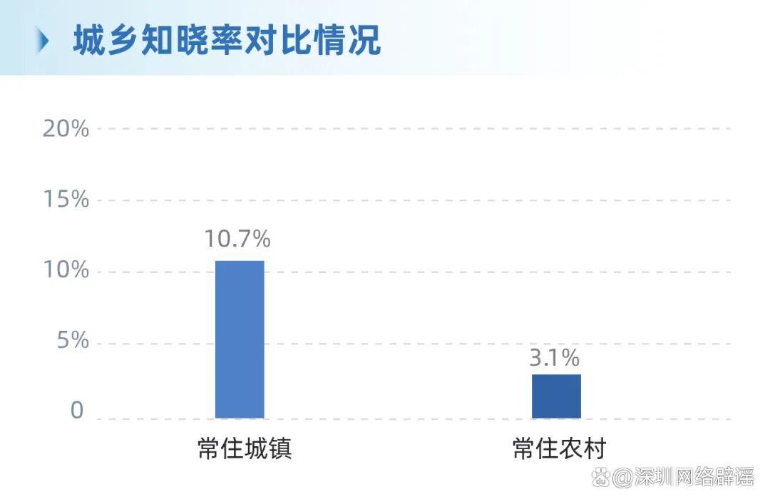 ·城鄉(xiāng)差異:城鎮(zhèn)常住群體知曉率(10.7%)高于農(nóng)村常住群體(3.1%),農(nóng)村普及存在短板。