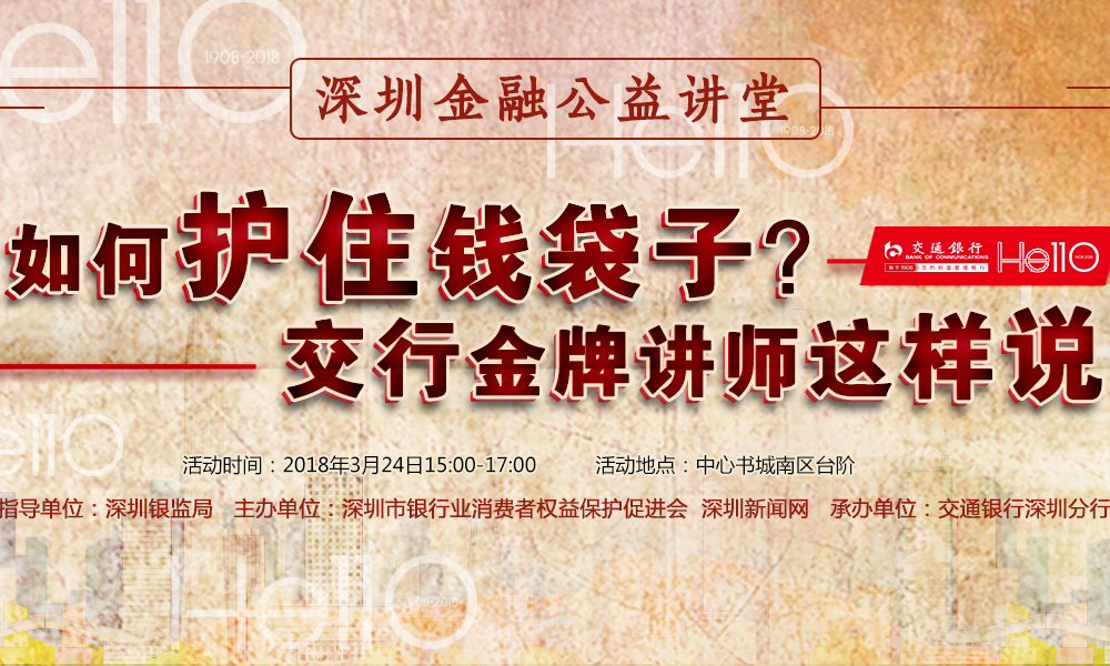 3月24日,深圳新聞網(wǎng)攜手深圳市銀行業(yè)消費者權益保護促進會舉辦的《深圳金融公益講堂》,將邀請交通銀行深圳分行金牌講師,結合110周年熱點,回顧交行百年歷史變遷,分析2018年理財趨勢,著眼消費者權益保護話題,以實際案例,深入淺出地開展一堂內容豐富實用的金融大講堂。